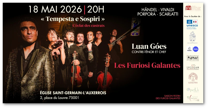 Après le grand succès de la Salle Cortot, lieu emblématique de la vie musicale parisienne, l’Église Saint Germain l’auxerrois accueille le contre-ténor et chef Luan Góes et l’ensemble Les Furiosi Galantes pour un concert exceptionnel consacré à l’art des virtuoses du baroque avec un programme d’une intensité expressive rare, inspiré de la tradition des castrats des XVIIe et XVIIIe siècles.